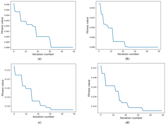 The change process of iteration number and fitness value. (a) Jilan Road. (b) Qingwei Road. (c) Mocheng Road. (d) Haier Road.