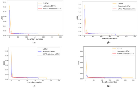 In this paper, early stopping is set in the training process, and this method can effectively avoid overfitting. The earlier the model jumps out of training, the better the actual performance of the model. As shown in Figure 9, the number of training iterations and the loss value curves of the GWO-attention-LSTM model, attention-LSTM model, and LSTM model are compared. It can be seen that the number of iterations of both the GWO-attention-LSTM model and the attention-LSTM model are significantly reduced compared to the LSTM model. Among them, the GWO-attention-LSTM model has the least number of training iterations and the fastest decrease in the loss value MSE. It can be seen that the attention mechanism increases the weight of important feature information, and the model can capture the hidden patterns in the time series faster. Moreover, because the GWO algorithm optimizes the initial weight parameters, the attention mechanism can calculate the appropriate weight values faster and more accurately. Therefore, the GWO-attention-LSTM model has better model performance compared with other prediction models.