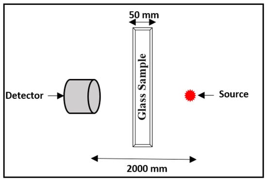 According to their fields, operators behind the glass sample are exposed to different energies of gamma rays. A NaI(Tl) detector measuring “2 × 2” and various isotropic radioactive point sources, including I-131, Cs-137, and Co-60, is included in the simulation setup, as seen in Figure 1. These sources release gamma rays with energy ranging from 0.36 to 0.66 to 1.17 to 1.33 MeV. Astronauts in spacecrafts are exposed to these sources, as well as extremely high energy sources (5MeV and 10 MeV), from gamma-ray bursts, blazars, and pulsars, which will require very thick shielding materials due to the loss the most of the photons’ energy before being exposed to the astronauts [,]. However, due to unifying our shielding thickness for all studied materials, we used the same thickness over the whole range of energies. Each source is on the other side of the glass sample, on the horizontal plane. The glass sample can be made from any of the varieties of glass specified in Table 1.