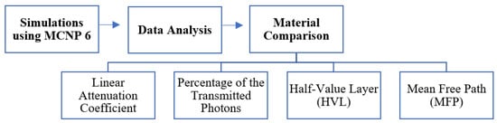Three critical parameters should be compared between ordinary glass and glass doped with nanoparticles, starting with Monte Carlo N-Particle (MCNP) simulations of six different glass shielding materials. After that, data analysis must be conducted as depicted in Figure 2 in order to obtain the required shielding properties. The half-value layer (HVL), which represents the thickness of the absorber that will reduce the gamma rays to half, the mean free path (MFP), which is the average dispersion, and the percentage of photons transmitted, which is required to comprehend how the shield glass affects the number of photons transmitted depending on their density and material, are all components of the linear attenuation coefficient.