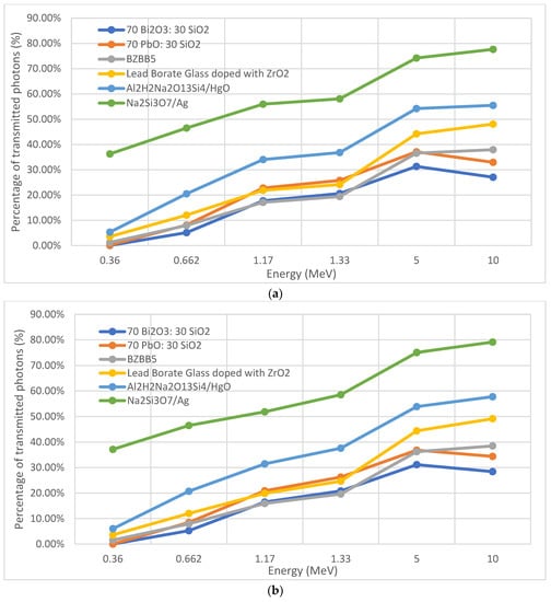 The percentage of transmitted photons should be taken into account while defining shielding materials. There are two ways to select this parameter, as illustrated in Figure 3. The first technique calculates the photon intensity ratio with and without the shield at various energies using simulations. The second technique computes the percentage of transmitted photons based on the linear attenuation coefficient obtained from XCOM using Equation (1). High-density materials, such as 70 Bismuth(III) oxide:30 Silica, have the lowest percentage of transmitted photons, which is close to 0% at low energies, as seen in Figure 3a,b due to their high linear attenuation coefficient, as previously mentioned. On the other hand, low-density materials, such as Na2Si3O7/Ag, have a high percentage of transmitted photons, especially at high energies, due to their low linear attenuation coefficient.