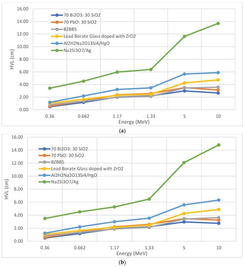 HVL is a crucial parameter for comparing the shielding performance of materials since different materials attenuate radiation to different degrees. Table 4 lists the HVL for the six shielding materials, representing the material thickness that will attenuate half of the gamma rays []. As shown in Figure 4a,b, the low-density materials and high energy sources have high HVL, which means that they will require more material thickness to attenuate the gamma rays completely, which is also concluded from the percentage of transmitted photons for the low-density materials and high-energy sources. Especially for Na2Si3O7/Ag glass for the energies above 1.33 MeV, it shows an extreme increase in the percentage of transmitted photons, and this clearly indicates that this material does not attenuate photons with high effectiveness at high energies due to the low value of the linear attenuation coefficient at those energy ranges for this material, which are less than 0.1 cm−1.