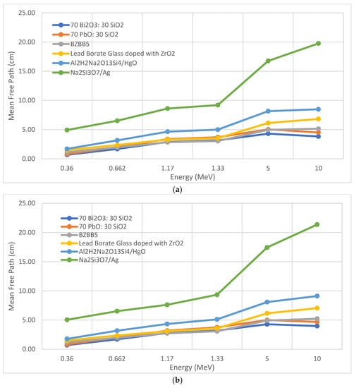MFP is the opposite of the linear attenuation coefficient and, with a lower value, means a more effective material. Table 5 shows MFP for the selected materials, which describes the average distance of the particles before the interactions []. As shown in Figure 5a,b, the low-density materials and high-energy sources have high MFP, which means the particles cross the materials for high distances before interacting with the low-density materials and high energy source, which is also concluded from the percentage of transmitted photons and HVL above for those materials at high-energy sources.