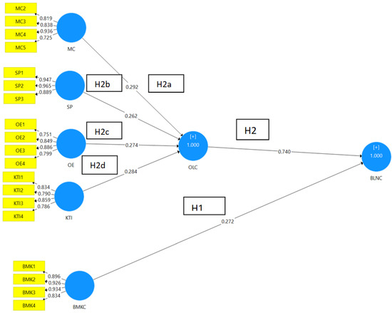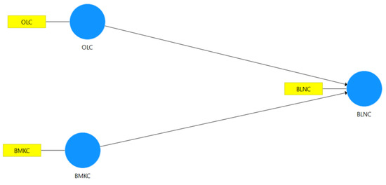 For the structural model analysis, the bootstrapping procedure was applied (500 randomly drawn samples) (Table 6 and Figure 3). Table 6 presents that BMK, KTI, MC, OE, and SP are positively and significantly related to BLN.