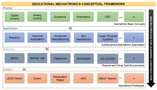 The process perspective is oriented to mechatronics’ basic concepts as a process. The application perspective includes all the applications from the basic concepts of mechatronics. Then, the scenario perspective contextualizes the application in terms of the physical environment, such as a laboratory and existing academic spaces, or, on the other hand, a virtual environment, serving as a remote laboratory, digital twin lab, and so on. Finally, as a result of the integration of these perspectives, mechatronics artifacts in the specific context are obtained; this is called the artifact perspective, which also has the potential for reuse within semantic mechatronics components. The extended EMCF perspectives are shown in Figure 1.