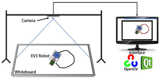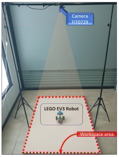 The EM training system enables a localization method that materializes through CV algorithms and techniques, allowing real-time data, tracking the trajectory of a mobile robot, estimating angles, and finally employing this information in instructional activities. The minimum hardware requirements for the laptop running these algorithms are 512 MB of RAM, and 1 GHz CPU. The camera is the FIT0729 model, an 8000 K pixels driver-free camera of USB port with up to resolution, and a mm lens. Thanks to a structure with tripods, it is positioned at the height of 169 cm to obtain a complete workspace area view contained in a whiteboard (see Figure 3). It is worth mentioning that LEGO EV3 mobile robot is placed on the whiteboard workspace to conduct the instructional activities.