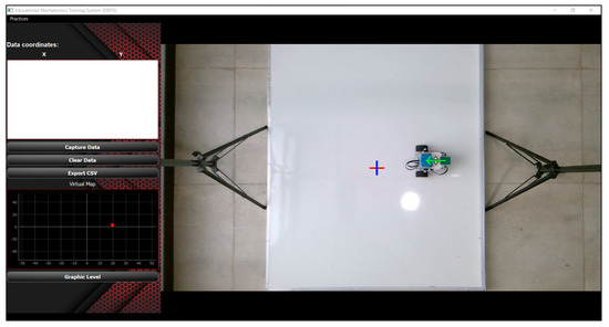 To conduct the practices, the student must initialize the EM training system user interface and place the LEGO EV3 mobile robot in the workspace. The system will localize the robot and add an arrow indicating the robot’s orientation; then, in the practices menu, select the practice to be conducted, as explained below.
