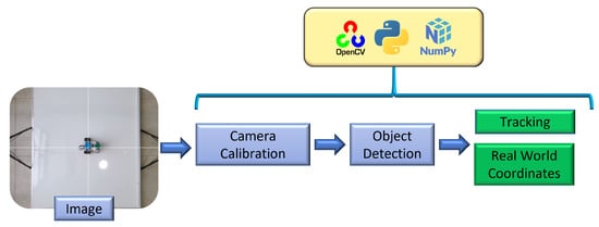 Figure 5 shows the complete image processing method to localize an object (LEGO EV3 mobile robot) implementing the OpenCV library in the python programming language. OpenCV is a powerful tool that includes most of the popular real-time CV algorithms oriented to efficient image processing. Moreover, the Numpy library operates arrays and matrices in the image processing procedure.