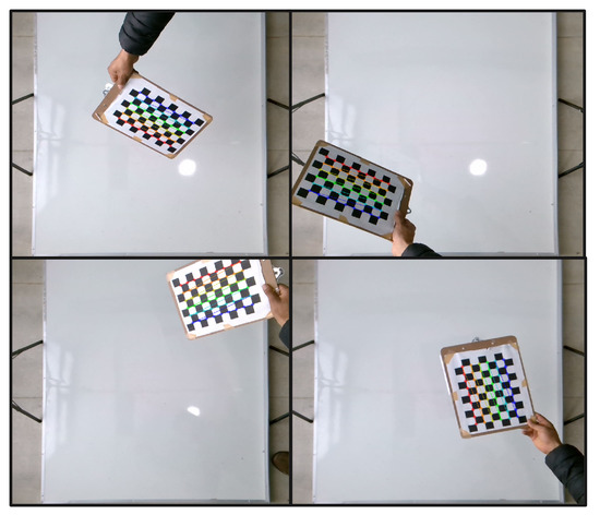 A chessboard pattern containing 9 × 6 squares with cm in size, printed on A4 paper, was employed to calibrate the camera. Then, forty images at different orientations were captured from the fixed-positioned camera. This procedure is depicted in Figure 6.