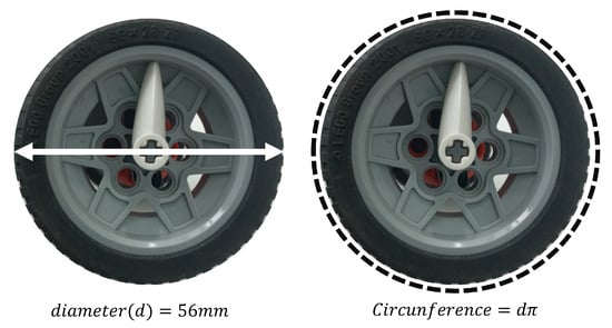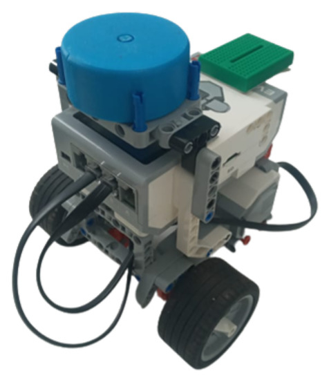 Education benefits from educational robots, one of the most popular mobile robots is the LEGO Robot. Many educational projects employ these robots to explore diverse engineering subjects due to their high configuration flexibility. In this work, LEGO MINDSTORMS® EV3 is used with a variant of the building instructions for Robot Educator, including two colored elements for detection purposes, as is shown in Figure 7.