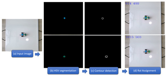 The elements to be detected are the blue object placed in front of the robot and the green one in the back (see Figure 7). The object detection process begins capturing the images (Figure 8a), then, taking advantage of the physical characteristics of the Tags, we propose employing the color segmentation process, which extracts a specific color model. There are a few color models, such as RGB (Red, Green, and Blue), HSL (Hue, Saturation, and Lightness), and HSV (Hue, Saturation, and Value). Thus, the HSV color model was employed to detect the Tags; moreover, this model segmentation allows easier processing [33]. In this way, The HSV parameters are set to segment blue and green color in two different channels as shown in Figure 8b.