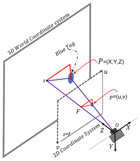 To estimate the coordinates in the real world, it is necessary to relate the coordinates of their corresponding image projections in 2D. That is, given obtain their three-dimensional equivalence . Figure 9 represents the pinhole camera model.