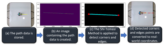 To avoid having many points displayed on the screen, only those coordinates where edges and corners are formed in the LEGO EV3 mobile robot’s path are of interest in this application. The implemented tracking method is the classic Shi-Tomasi method [35] (see Figure 10).
