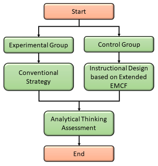 For the experimental group, the conventional teaching methodology could be applied; this includes using LEGO EV3 mobile robot, whiteboard, and projector as didactic resources. For the control group, the proposed extended EMCF could be applied; this includes using the LEGO EV3 mobile robot and the EMTS and the application of practice developed in the instructional design (see Section 4.1). This whole activity requires a class session of 60 min. Lastly, the students were asked to answer questions associated with one analytical thinking element process similar to [36]. The complete methodology depicted in Figure 11 is presented only for replicability of the research purposes since this work is focused on the development of the EMTS.