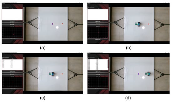 - Eventually, the student press the “Capture Data” button on the user interface (see Figure 12c), activating the capture of actual coordinates of the LEGO EV3 mobile robot and conducting a manual motion movement to the other point. At reach, the student should press the “Capture Data” button to deactivate the capture of coordinates (see Figure 12d).