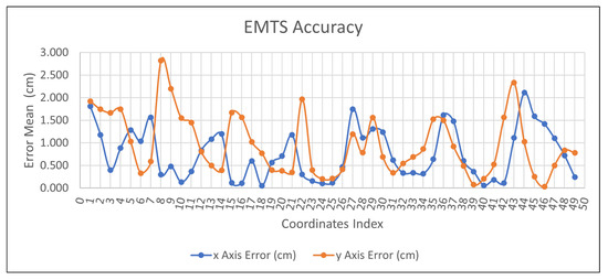 EMTS accuracy assessment for the X and x axis vs. coordinates index.