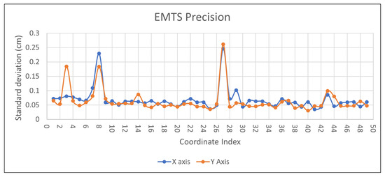 EM training system precision assessment, the standard deviation for the X and Y axis vs. coordinates index.