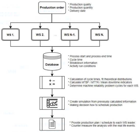 As Figure 1 presents, the framework provides a solution for a multi-workshop (WS) production layout where the inputs are given regarding the production (order quantity and quality, production steps as well as delivery date), and the machine reliability (mean time between failures—MTBF; mean time to repair—MTTR; mean downtime which represents the extra time). These pieces of information construct a database, which is the foundation of the Monte-Carlo simulation. The analysis of the simulation is the following activity, which provides enough information for the production performance, as well as shedding light on any changes in total process time and possible critical path changes. An additional scheduling method is also fitted in the framework to see what the state of the production schedule is as well as extra uncertainty information can be acquired that makes decision making more value based.