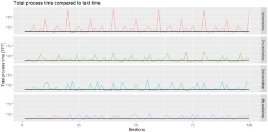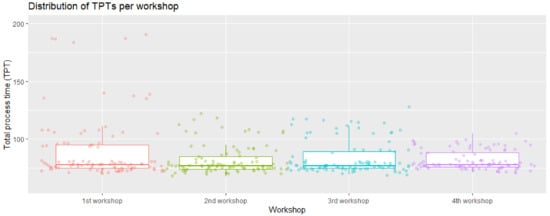 The simulation was carried out based on the inputs described in the previous section. As a result, we can see that all of the workshops manufacture one product at the same time on average, but differences can be also found. If the distribution of the TPT values is concerned, it can be clearly seen that the most stable workshop is the fourth () and because this workshop has the lowest variance, there are no outliers in the dataset. This is also presented in the Figure 4. boxplot diagram, where all the individual process runs and their brief statistics can be seen. The most uncertain workshop is the first since the variation is high: there are some iterations where TPT has significantly increased to around 200 min. For a clearer picture, additional descriptive statistics can be found in Table 4.