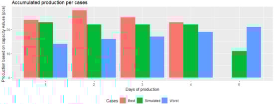 Complementary to this analysis, the worst and best cases were also analyzed where the least and most capacity days were implemented in the optimization model. As the diagram shows below (Figure 6), in the best-case scenario, there is no need for production on the last day (fifth), additionally, in the worst-case plan, it is impossible to produce the required amount of product.
