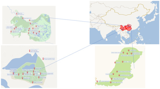 Firstly, the tourist attractions in the three EM regions are obtained through the recommendation of tourism websites, and the case studies are Longji Terrace Scenic Area in Guangxi, Qianhu Miao Village in Xijiang, Guizhou, and Xishuangbanna Dai Park in Yunnan. These three cases all belong to EM regions, rich in tourism resources but relatively underdeveloped in the economy. Therefore, economic revitalization is essential for poverty reduction and sustainable development through tourism development. At the same time, in EM regions, the tourism sector has achieved certain social and economic benefits. It is worth noting that the study of these three tourist destinations is very typical and feasible (Table 1; Figure 2).