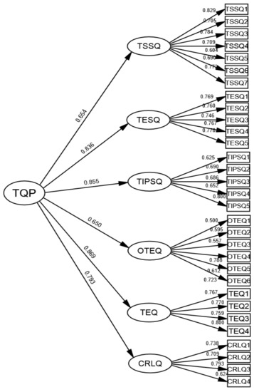 Table 2 shows that the TEQ total scale Cronbachʹs α is 0.939, which is higher than the acceptable level of 0.6, suggesting that the scale reliability was excellent. Meanwhile, if the composite reliability of latent variables was >0.6, it implied that the intrinsic quality of the model was ideal. In the second-order factor model, the composite reliability of the six first-order factors (latent variables) to the second-order factor (latent variables) was 0.9028 (>0.6; Table 6). Based on the reliability test standard [85], the measurement of latent variables in this second-order factor model had good reliability.
