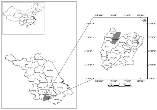 Guanlin Town is in southwest Yixing City, Jiangsu Province, China, between east longitude 119°38′–119°46′, north latitude 31°26′–31°33′, at the intersections of the Jiangsu, Zhejiang, and Anhui provinces (Figure 1). The town covers an area of 105.90 km2 and is in the heartland of the Yangtze River Delta Economic Circle, the most economically developed region of China. The resident and working population of this rural area exceeds 68,000, accounting for ~76% of the total population (reference to 2015) and represents an increase in the population of almost 3% compared to that in 2005. Based on the various advantages of good climate conditions, abundant water resources and a developed transportation system, Guanlin Town has experienced a rapid growth in aquaculture industries. Guanlin Town has recently emerged as the industrial and trade center of Yixing City, with this city having achieved a gross industrial production of 18.14 billion Chinese Yuan in 2015. The rapid growth of industrial enterprises and aqua-cultural activities in this area has resulted in large areas of cultivated land, water areas and inland beaches being converted to aquaculture surface and enterprise land, with the structure of rural land use simultaneously experiencing obvious changes.