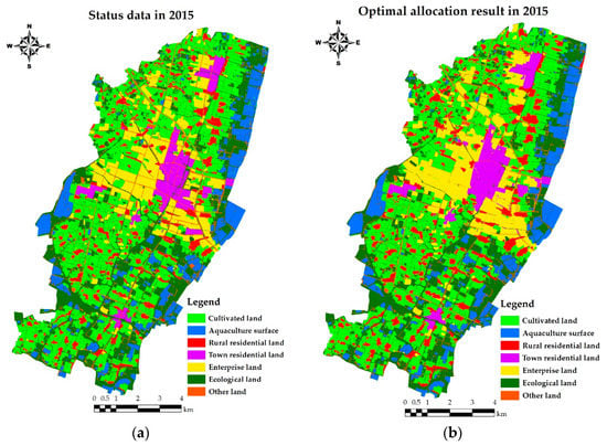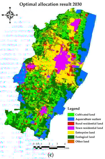 The optimal allocation results of land use were obtained after a few steps including running related files, loading the basic data, initializing parameters, using Raster to ASCII in ArcMap. The land use map for 2015 is shown in Figure 3a. Based on the land use map in 2015, optimal allocation results in 2015 and 2030 were shown in Figure 3b,c and Table 8. A comparison of actual land use in 2015 with predicted land use in 2030 indicated initial increases in the areas of cultivated land and rural residential land, followed by decreases, with overall decreasing trends of 13.7% and 6.2%, respectively. These two land-use types showed relatively concentrated spatial distributions. The areas of aquaculture and “other” increased progressively by rates of 50.5% and 13.7%, respectively. There were sporadic reductions in the areas of aquaculture in Qiancheng and Nanzhuang. The areas of enterprise land and town residential land first decreased and then increased by 2.3% and 1.9%, respectively. The spatial distributions of enterprise land in the southeast and west of the built-up area were more concentrated. The area of ecological land decreased by 1.64 km2, mainly due to being transformed into aquaculture land.