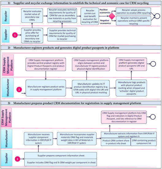 - The information processes assessed that a Circular CRM supply management system needs to include: a Digital Product Passport with a documentation register at product series level accessible via physical product tags; CRM contents documentation prepared by the manufacturer with information on the materials content; a list of high CRM content components in the product; a sorting of products with high and low CRM content at the collection stage; a disassembly map of a product from the manufacturer to improve component extraction for reuse/recycling; and feedback on CRM recycling performance of products and components from recyclers to manufacturers.