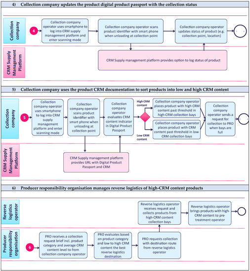 - The use of the digital product passport CRM content flag per type of CRM by collection companies to separate products with high-CRM and low-CRM content in a relevant grouping of CRMs into different collection bays for further reverse logistics purposes (workflow 5 Figure 2);