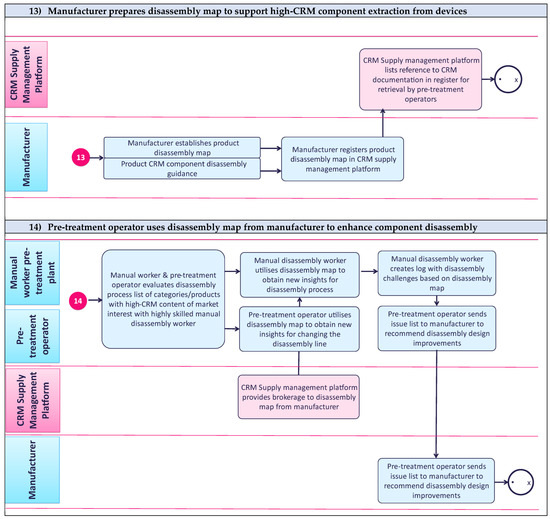 - The provisioning of a disassembly map of the product and specific CRM containing components by the manufacturer, with feedback back from the pre-treatment operator to the manufacturer on disassembly issues based on a disassembly log (workflows 13 and 14 Figure 3).