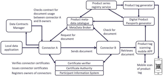 The components of the architecture are shown in Figure 4 in their relationship to each other, and how they would sit in terms of IT servers across information providers, consumers and the circular CRM supply management platform cloud. The user interactions within the architecture are foreseen at three levels: a standard centralized user interface to setup the product model registration and public digital product passport information structures and to verify connectors that are exposed; a decentralized interface at the connector level to setup connectors and associated applications and to provide for data policies that are stored in the data contracts manager, to set access conditions to the provided information through a connector; and a decentralized mobile application interface to scan the product tag to access the Digital Product Passport at the related URL as an entry point. Different decisions-making routes can then be built through the architecture, such as to identify the organization types or roles that can access particular documents through the connector data policies. New applications can be built with a connector to link to the data space to obtain and process available data, and information entry can be made possible from a mobile application that can read the Digital Product Passport or write to it given an authorization procedure to update the product life cycle information. The approach allows for storing data de-centrally at the data provider side enabling data sovereignty, as well as centrally in a Digital Product Passport data-store, and mixing these approaches. It allows for creating visibility on who owns a particular dataset in a structured manner, and logging product life cycle stages with timestamps to enhance product life cycle transparency.