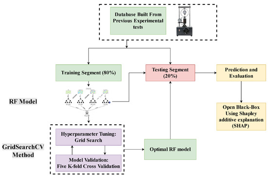 The RF approach described in this section in is used to forecast the UCS of clayey soil stabilized by geopolymers. The steps used in this research are depicted in Figure 1. First, the entire database was randomly divided into two data segments: training and testing. The prediction model is then trained using RF methods. Next, the hyperparameters of the selected algorithms are tuned based on the training data segment using the tuning method outlined in Section 2.4. The model performance is then tested during the training stage using 5-fold cross-validation. Once the ideal hyperparameters have been found, the test set is used to evaluate the final model prediction error. Finally, the average SHAP value between the contributing variables and the predicted UCS are then analyzed using SHAP analysis.