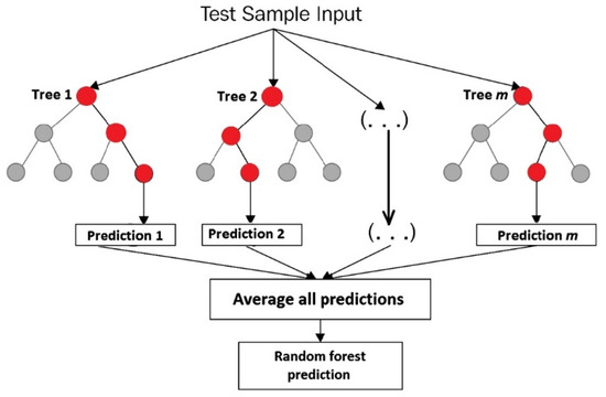 Random Forest (RF), which has become one of the most popular techniques for inductive inference, is theoretically based on the decision tree [47]. A decision tree utilizes the mode or means as the forecast for the observations in the area after recursively dividing the feature space into several rectangular areas [48,49,50]. It is also referred to as the decision tree approach since the criteria used to divide the feature space may be represented as a tree. Data with similar response values are clustered together for a regression task, and each region is projected with a fixed value (the mean). The mean squared error (MSE) is frequently used for regression issues as a loss function, and the proper splitting points and splitting variables are chosen by minimizing the loss function. After minimizing the loss function, the point pair and splitting variable can be selected. The procedures for using a binary regression tree to solve this problem can be broken down into four parts [50].