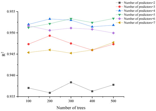 It was feasible to identify the parameters that matched the predicted model characteristics by using the GridSearchCV method’s exhaustive parameter search. This method makes it simpler to locate parameters that have the best model estimate accuracy [60]. By specifying the hyperparameter’s values and ranges and using the GridSearchCV function, the optimal set of RF hyperparameters was discovered. Figure 3 displays the outcomes of the GridSearchCV. The 500-tree forest with five predictors produces the maximum R2. The models started to overfit when there were more than five predictors. More predictors in a model tend to increase the risk of overfitting the data due to the curse of dimensionality. Additionally, a simpler model lowers the cost of computation. Consequently, 500 trees and five predictors were used to create the final RF model.