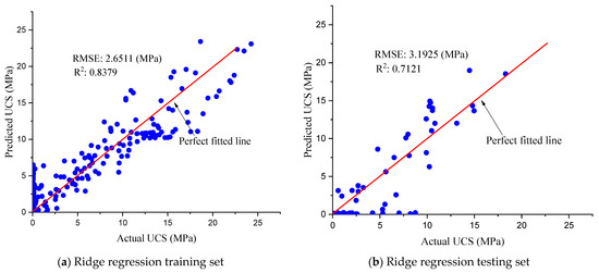 The R2 values from the ridge regression model for both the testing and training sets are 0.7121 and 0.8379, respectively, as shown in Figure 5. A lower R2 value indicates underfitting and suggests that the model cannot adequately account for data variance [49]. In comparison to the RF, the ridge regression performed significantly poorer. This is most likely due to the linear regression model’s inability to handle the UCS and variable nonlinearity.