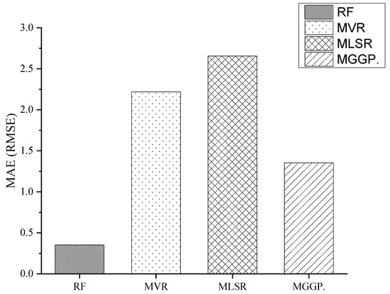 In this study, to emphasize the prediction power of the RF model, the results from the model are compared to those of the most recently developed white-box ML models. Three white-box ML models were considered: multivariable regression model (MLSR) [34], multi-gen genetic programming (MGGP) [34], and multivariable regression (MVR) [59]. The goal of MGGP is to produce “multi-gene” mathematical models of predictor response data, which are composed of low-order nonlinear combinations of the input variables [61]. On the other side, MLSR and MVR were based on the conventional linear regression method. The accuracy of the models stated above was evaluated using their Mean Absolute Error (MAE). In Figure 6, the MAE values for all previously produced models and for the RF model are presented to demonstrate the model’s correctness. The proposed model in this study has the lowest MAE, as demonstrated. Furthermore, among pre-existing white-box ML models, the MGGP [34] correlation model is the most accurate, while the MLSR [34] correlation model is the poorest.