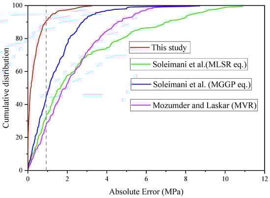 Table 2 summarizes other statistical quality indicators for the pre-existing models and the RF model for the whole dataset prediction. From Table 2, the RF model in this study has the lowest MAE and RMSE, as well as the maximum R2, demonstrating that it is the most efficient and robust model. Figure 7 displays the absolute error for the UCS prediction versus the cumulative frequency of the proposed and pre-existing models. The proposed model (RF) predicts the UCS of 70% of the data with an absolute error of fewer than 0.4 MPa and 80% with an absolute error of fewer than 0.57 MPa. On the other hand, the proposed model in this study predicted only 10% of the experimental data with an absolute error higher than 0.93 MPa. The model from Soleimani et al. [34] (MGGP eq.), which was the second most precise model, correctly predicted 14% of the experimental data and 21% of the UCS measurements with absolute relative errors lower than 0.4 MPa and 0.57 MPa, respectively.