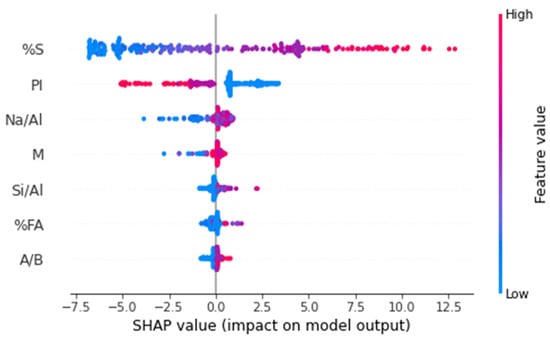 The summary plot is shown in Figure 8, which illustrates the trend of the corresponding variable and the distribution of SHAP values for each characteristic. The specific SHAP value is shown on the x-axis of the summary plot, while the input variables that were employed in this research are ordered according to their importance along the y-axis. Depending on which side the red dots are on, the red instances signify higher values with an impact on the model prediction. SHAP values for each variable are shown against the change in their respective inputs on the horizontal x-axis, illustrating the degree to which each variable can be predicted (blue to red). It is clear that ground-granulated blast-furnace slag (%S), plasticity index (PI), the ratios of sodium to aluminum, and the molar concentrations of an alkali solution (M) all considerably contribute to the UCS prediction. The amount of fly ash percentage (FA%), the alkali-to-binder ratio (A/B), and the silicon-to-aluminum ratio (Si/Al) are less relevant. The improvement in UCS that results from an increase in S is seen in Figure 8. This was to be expected since a larger content of S is a sign of a higher quantity of binder being present in the mixture and, thus, a higher UCS. The findings obtained from this analysis are in high accordance with the ones published by several other researchers [34,59,63]. According to the findings of the SHAP study, a higher PI leads to a lower UCS, as observed in Figure 8. This result was also expected. If the PI increases, the proportion of polymer emulsion to the bentonite content, which normally stays together, will change. In addition, research has shown that raising the PI reduces the stiffness and peak strength of the soil while also making it more ductile [34,64]. As shown in Figure 8, increasing both M and A/B improves the UCS of the geopolymer-stabilized clayey soil. This result is not a surprise, given that the concentration of alkali (NaOH) is one of the most important parameters in geopolymerization [37]. A higher concentration of NaOH enhances the UCS while simultaneously reducing the mix workability. This is caused by an increase in the solubility of aluminosilicate [34,65,66,67].