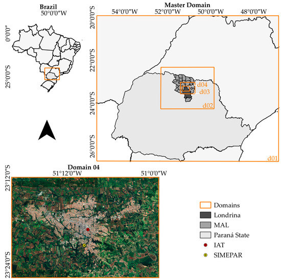 Numerical simulations were executed from 2017, September 6th 00 UTC to September 16th 00 UTC (240 simulated hours), since it was a period of relatively calm winds, clear-sky days, and no rainfall. The first 24 h of simulation were discarded from the analysis to avoid the spin-up effect [62,63]. The model performance analysis was conducted evaluating the values obtained from the model with those measured at the IAT and SIMEPAR monitoring stations (Figure 1) by using Pearson’s Correlation Coefficient (r), Mean Bias (MB), Root-Mean-Square Error (RMSE), and Pielke skill score (SPielke) [62,64,65]. The IAT station (latitude: 23.319° S; longitude: 51.155° W) is located in the central area of Londrina, set and funded by Instituto Água e Terra (Figure S1), while SIMEPAR (latitude: 23.355° S; longitude: 51.161° W) is in the south of surrounding areas of Londrina, supported by Sistema Meteorológico do Paraná and Instituto de Desenvolvimento Rural do Paraná (Figure S1). These are the meteorological stations with observations available in the simulation period in the study region used for validation.