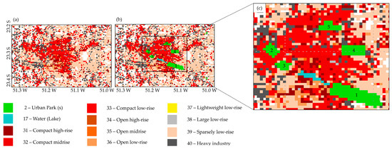Local Climate Zone urban classification for MAL (d04), (a) WUDAPT level “0”, (b) GIs (2—urban parks, and 17—lake) identification, and (c) zoom-in for the five locations of urban parks and the lake.