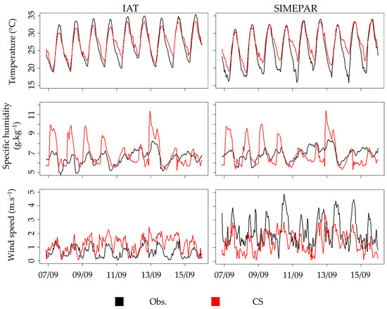 Figure 3 shows the comparison between observed and simulated values in SB (considered here as a reference to compare with the observations) for IAT and SIMEPAR stations (T2, Q2, and WS10) from September 6 to 16, 2017. Table 4 shows the statistical performance of the model.