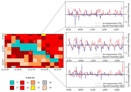 The effects of the artificial Londrina urban lake were assessed by analyzing the T2 and Q2 simulated values around the lake (Figure 4), i.e., comparing simulations SA with SB by the differential percentage (corresponding to ((SB-SA)/SB) × 100), where positive values indicate that the simulated values in SB were higher in the presence of the lake, and negative values indicate that the simulated values in SB were lower in the presence of the lake. Weather contributions were evaluated for the highly impervious urban classes with few or no trees (classes 31, 32, and 33).