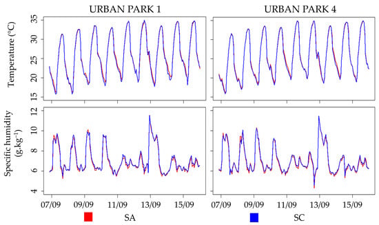 Temporal evaluation of temperature and specific humidity simulated at UP1 and UP4. The red line is the data by SA, while the blue line represents the data by SC.