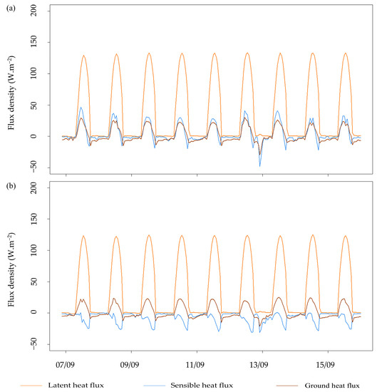 A sudden drop in sensible heat fluxes and ground heat was recorded at the end of the day on September 12, 2017, which can be explained by a change in the temperature profile between 19:00 and 21:00, as shown in Figure S4. In the SA simulation, where the lake is changed for the LCZ, the implementation of the urban area increases the energy storage capacity due to the thermal properties of building materials [100]. Those materials re-emit that energy by the longwave radiation during nighttime, which can enhance UHI intensity [97].