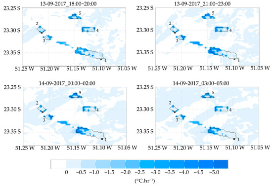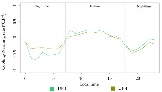 The temporal evolution of cooling/warming rates in UP1 and UP4 was similar to heating rates after sunrise (6:30) and cooling rates in the nighttime, after sunset (18:15). Greater intensities were found between 7:00 p.m. and 6:00 a.m. (Figure 7 and Figure S5).