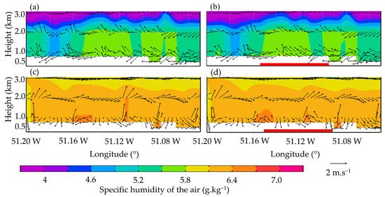 Specific air humidity (g.kg−1), vertical and zonal component of the wind (m.s−1) for UP 1 at 23.35° S. Note: (a,b) results without and with UP1 for 15:00 on 9 July 2017, respectively; (c,d) results without and with UP1 for 12:00 on 9 August 2017, respectively. The red line represents the longitudinal dimension of UP1.