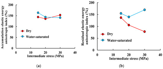 - For water-saturated coal samples, the overall energy is weakened due to the water adsorption, as indicated by the lower values in the total, elastic, and dissipated energy evolution curves than dry coal samples. In addition, all the values of pre-peak and post-peak dissipated energy variations rates of water-saturated coal samples under different intermediate stresses and loading directions are lower than the dry coal samples. The elastic energy ratio evolution of dry coal samples mainly behaves as an increasing-then-decreasing trend. In contrast, the elastic energy ratio evolution shows a decreasing trend for most water-saturated coal samples.