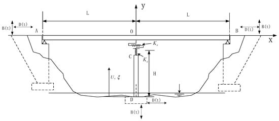 This paper mainly studies the separation of a pier and a beam and the impact of the separation on pier failure, which lays a foundation for the study of the combined influence of multispan structures in the future. Therefore, a double-span prestressed box girder bridge was selected in this paper, as shown in Figure 1. Both ends of the main beam are hinged with the ground, and the pier bottom is fixed. The displacements of horizontal excitation and vertical excitation are D(t) and B(t), respectively. The axial stiffness of the bearing is and the shear stiffness is . Three assumptions have been made, as follows: