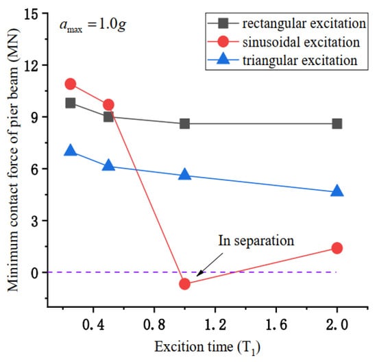 Figure 3 shows the relationship between pier–beam vertical contact force and excitation conditions. The range of excitation duration is , and the range of excitation acceleration amplitude is 0.25~1.0 g. The value is the vertical first-order natural period of the bridge. Under the rectangular pulse excitation, the contact force changes the least. When the pulse excitation time exceeds , the contact force remains unchanged, and the minimum contact force is 8.6 MN. Under triangular pulse excitation, the vertical dynamic response of the pier beam increases monotonically with the increase in excitation duration and amplitude of excitation acceleration. When the excitation duration is and the excitation acceleration amplitude is 1.0 g, the minimum contact force is 4.3 MN.